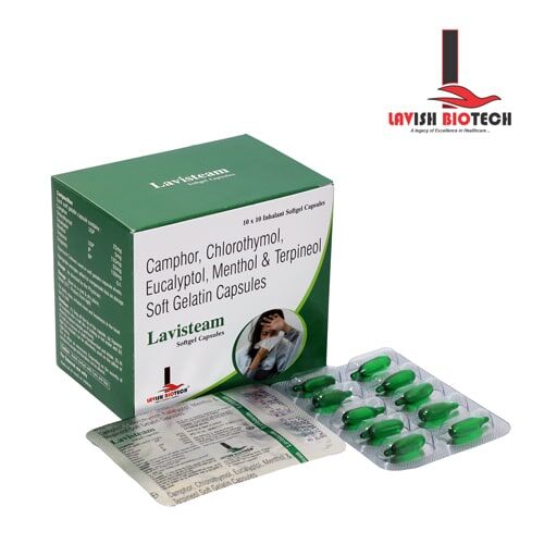 Lavisteam soft gel capsule is composed of four major components Camphor, Eucalyptol, Chlorothymol, Menthol, and Terpineol. It is used to treat inflammatory conditions and provides instant relief from congestion, cough, sore throat, etc.
